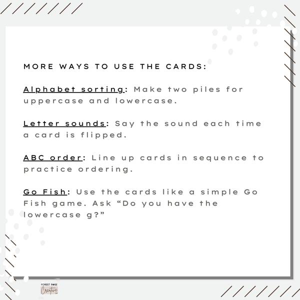 - Go Fish: Use the cards like a simple Go Fish game. Ask “Do you have the lowercase g?”